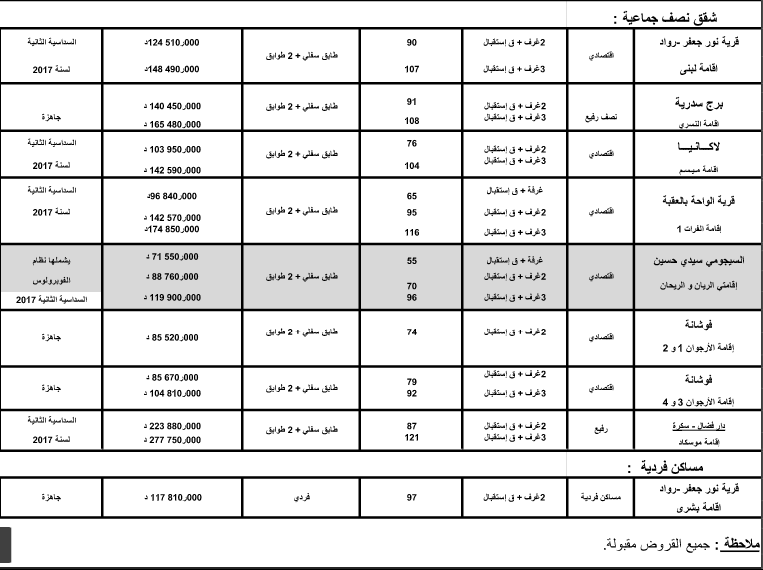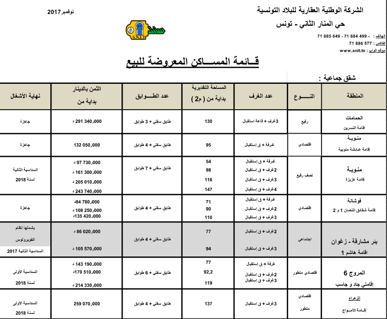 نشرت الشركة الوطنية العقارية للبلاد التونسية، اليوم الأربعاء 05 أفريل 2017 قائمة المساكن المعروضة للبيع لشهر أفريل.