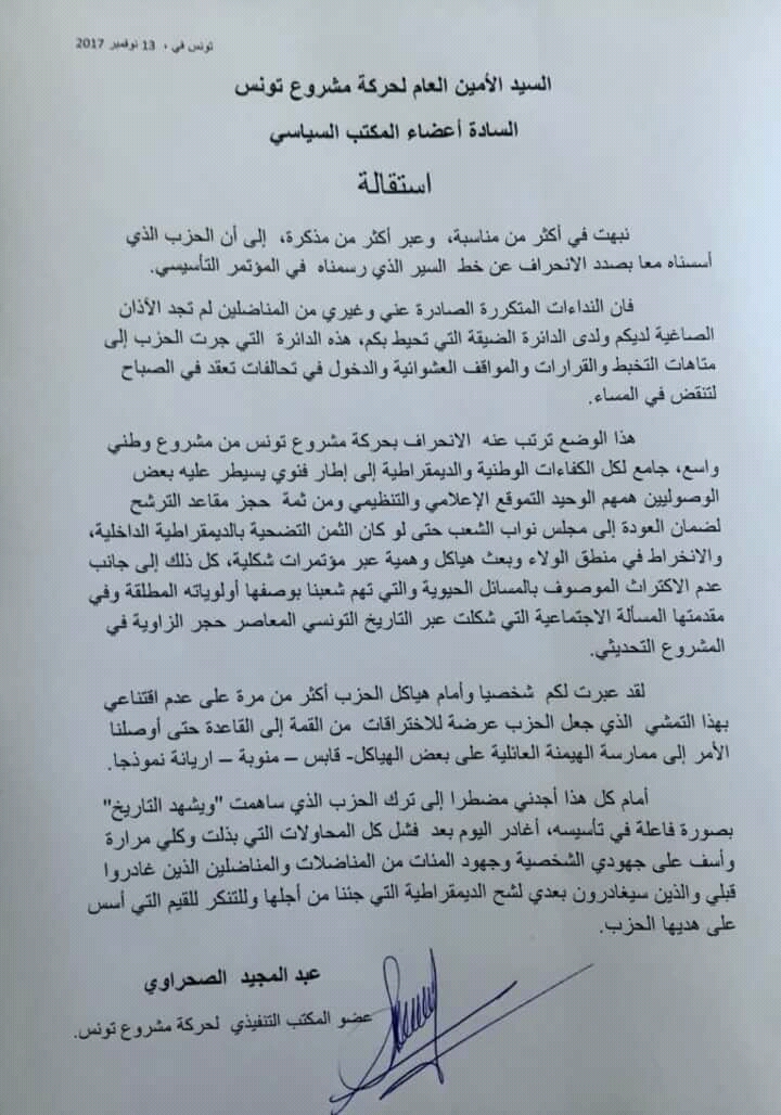 أعلن القيادي بحركة مشروع تونس عبد المجيد الصحراوي، اليوم الاثنين 13 نوفمبر 2017، اِستقالته من الحزب بسبب "تجاوزات وتهميش وإقصاء داخل الحركة".
