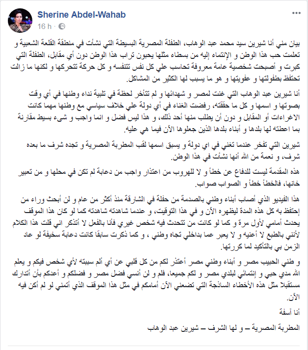 واختتمت الفنانة بيانها قائلة: "وطني الحبيب مصر وأبناء وطني مصر أعتذر لكم من كل قلبي عن أي ألم سببته لأي شخص فيكم ويعلم الله مدي حبي وانتمائي لبلدي مصر و لكم جميعا".