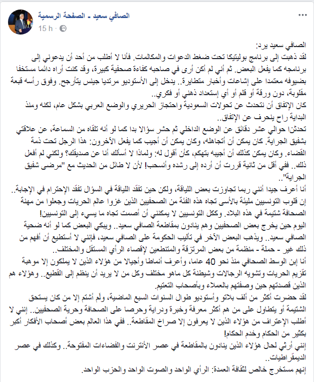 وقال الصافي سعيد، عبر تدوينة على صفحته بالفايسبوك، "أنا أعرف جيدا أنني ربما تجاوزت بعض اللياقة، ولكن حين تفقد اللياقة في السؤال تفقد الإحترام في الإجابة"، مضيفا "إن قلوب التونسيين مليئة بالأسى تجاه هذه الفئة من الصحفيين الذين غزوا عالم الحريات وجعلوا من مهنة الصحافة شتيمة في هذه البلاد. وككل التونسيين لا يمكنني أن أصمت تجاه ما يسيء إلى التونسيين! .