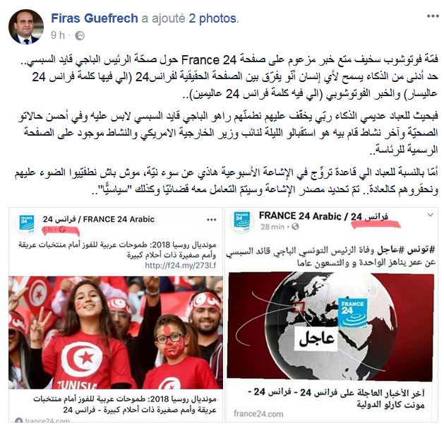يُذكر أنّه تمّ ليلة أمس بثّ إشاعة وفاة رئيس الجمهورية الباجي قائد السبسي بعد اِنتحال صفة قناة "فرانس 24".