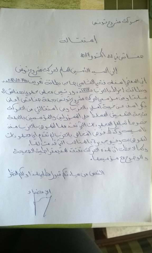 وقال القابسي، في نص اِستقالته التي نشرها على صفحته الخاصة بالفايسبوك، "في ظل الظروف التي يمر بها حركة مشروع تونس بصفاقس و المرتكزة على اللاشفافية و الغموض الذي يكتنفها و لعبة الكواليس اللامتناهية فاني انشر استقالتي علنا بعد شهر من تقديمها رسميا للامين العام للحزب و بعد اللامبالاة من طرف قيادي الحركة و اني اسف كمؤسس و قيادي للحركة بصفاقس لاتخاذ هذا القرار".