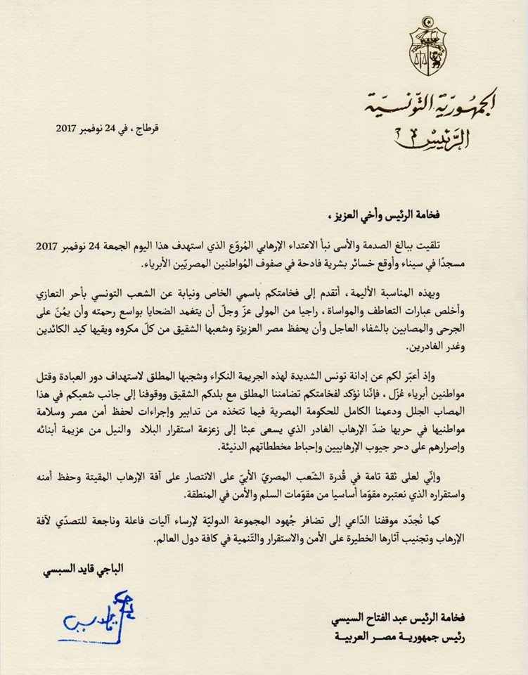 وبعث الرئيس الباجي قائد السبسي رسالة تعزية إلى نظيره المصري عبد الفتاح السيسي، في ما يلي نصها :