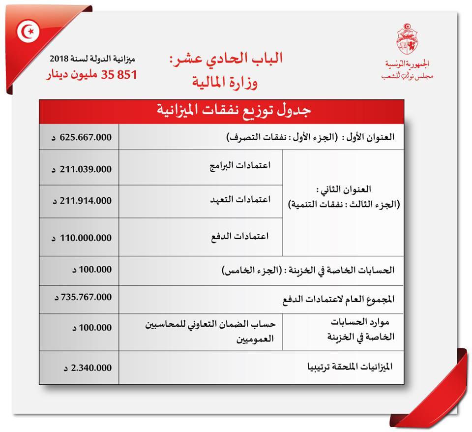وتم تخصيص نفقات تصرف بـ625.667 مليون دينار واعتمادات دفع بقيمة 735.767 مليون دينار وميزانية ملحقة ترتيبيا بقيمة 2.340 مليون دينار.