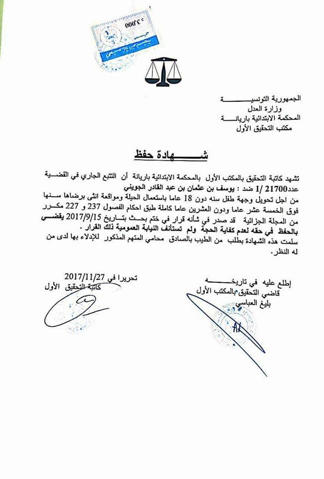 وجاء في شهادة صادرة يوم أمس الاثنين عن مكتب التحقيق الأول بالمحكمة، نشرت "حقائق" نسخة منها، أنّ "القضية ضدّ النائب تتمثل في تحويل وجهة طفل دون 18 سنة باِستعمال الحيلة ومواقعة أنثى برضاها سنها فوق 15 سنة ودون العشرين عاما، قد صدر في شأنه قرار في ختم بحث بتاريخ 19 سبتمبر 2017 يقضي بالحفظ في حقه لعدم كفاية الحجة ولم تستأنف النيابة العمومية ذلك القرار".