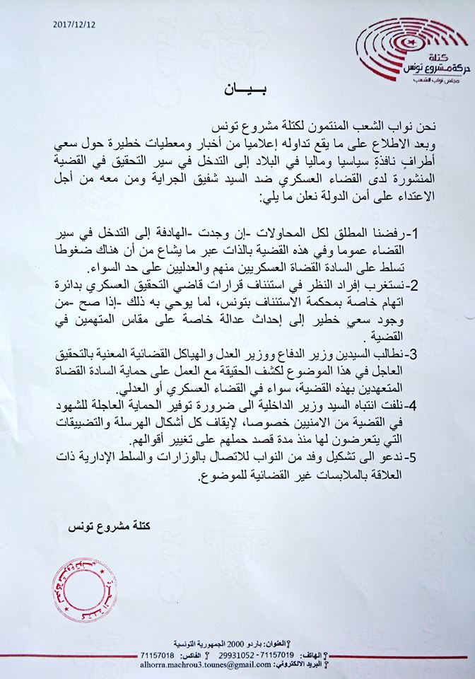 وأكّد النواب "رفضهم المطلق لكل المحاولات -إن وجدت -الهادفة إلى التدخل في سير القضاء عموما وفي هذه القضية بالذات عبر ما يشاع من أن هناك ضغوطا تسلط على القضاة العسكريين منهم والعدليين على حد السواء"، معبرين عن "اِستغرابهم من إفراد النظر في استئناف قرارات قاضي التحقيق العسكري بدائرة اتهام خاصة بمحكمة الاستئناف بتونس، لما يوحي به ذلك -إذا صح -من وجود سعيٍ خطير إلى إحداث عدالة خاصة على مقاس المتهمين في القضية".