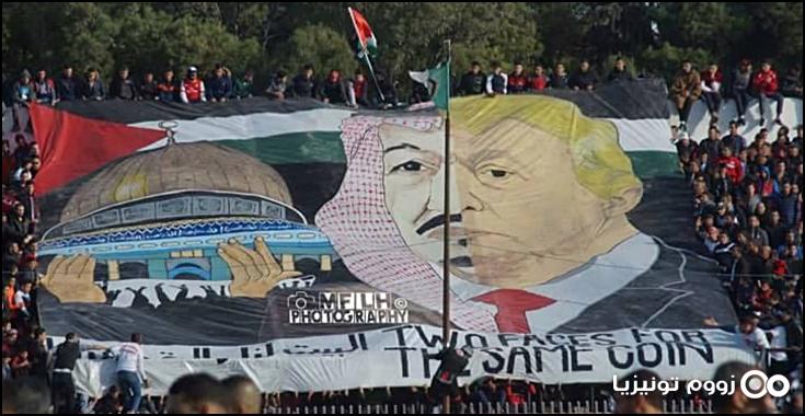تداول ناشطون على موقع التواصل الاجتماعي "تويتر"، صورة لجماهير رياضية في أحد مدرجات ملاعب كرة القدم العربية، وهي تحمل لافتة كبيرة تحمل صورة تجمع بين العاهل السعودي الملك سلمان بن عبدالعزيز والرئيس الأمريكي دونالد ترامب، وإلى جوارها صورة المسجد الأقصى.