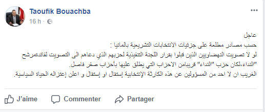 وأضاف بوعشبة، في تدوينة على الفايسبوك، أنّه نقلاً عن مصادر مطلعة فإنّ "النهضاويين" الذين قبلوا بقرار اللجنة التنفيذية لحزبهم هم من صوتوا لمرشح النداء، مُستغرباً من عدم إعلان أي أحد من المسؤولين عن هذه الكارثة الانتخابية إستقالته أو إعتزاله الحياة السياسية، وفق تعبيره.