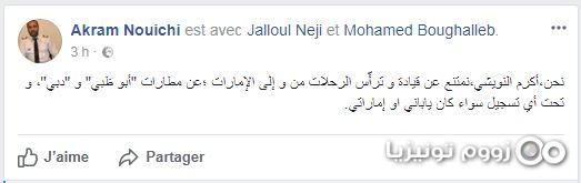 وقال أكرم النويشي أنّ الشركة اليابانية التي يشتغل بها عبرت عن دعمها للقرار الذي اِتخذه، مُوضّحاً أنّ تراجعه عن هذا القرار سيكون عندما "يحترم الإماراتيون أنفسهم ويعرفون حجم الشعب التونسي".