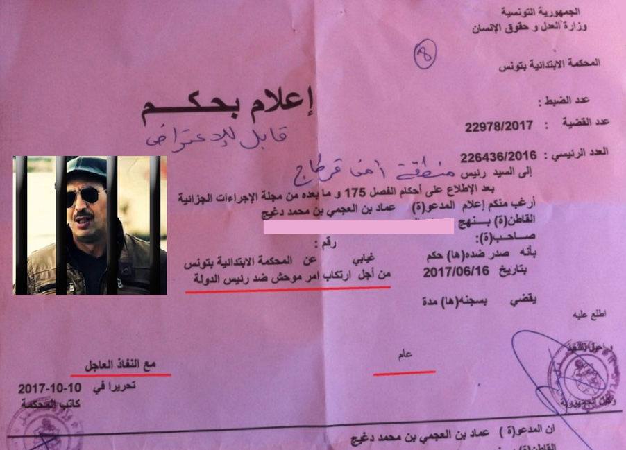 و وفق نسخة من "إعلام بالحكم" نشرها عماد دغيج، يوم الإثنين 25 ديسمبر 2017، فإنّ ذلك يأتي بسبب "اِرتكاب أمر موحش ضد رئيس الدولة".