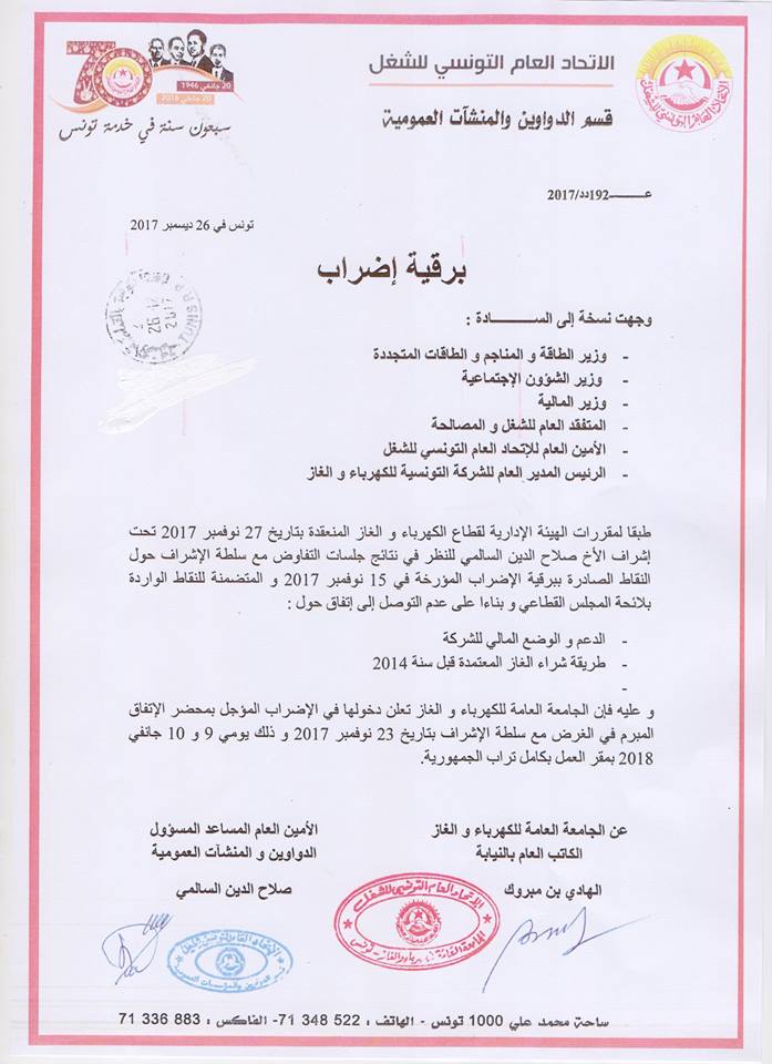 وأوضّحت الجامعة، في برقية إضراب أصدرتها اليوم الثلاثاء 26 ديسمبر 2017، وجّهت نسخة منها إلى كل من وزير الطاقة والمناجم والطاقات المتجددة خالد قدور ووزير الشؤون الاجتماعية محمد الطرابلسي والمتفقد العام للشغل والمصالحة والأمين العام للمنظمة الشغيلة والرئيس المدير العام للشركة التونسية للكهرباء والغاز، أنّ قرار الإضراب يأتي على خلفية عدم الاِتفاق بخصوص الدعم والوضع المالي للشركة التونسية للكهرباء والغاز وطريقة شراء الغاز المعتمدة قبل سنة 2014.