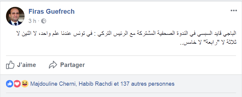 ووفق مستشار رئيس الجمهورية فراس قفراش، فإنّ رئيس الجمهورية خلال الندوة الصحفية المشتركة مع الرئيس التركي رجب طيب أردوغان قال " في تونس لنا علم واحد لا اثنين..لا ثلاثة ولا "رابعة" "، في إشارة منه لكون الرئيس ردّ بطريقة غير مباشرة على الرئيس التركي.
