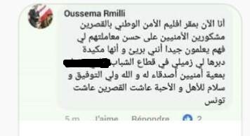 نشر المتهم أسامة الرميلي الموظف العمومي الذي تمّ إيقافه بالقصرين تدوينة على موقع التواصل الاجتماعي "الفايسبوك" من مركز الاحتفاظ به.