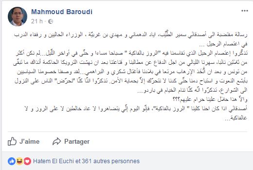 وذكّرهم البارودي بإعتصام الرحيل الذي شاركوا فيه سوية والذي تقاسموا فيه "الروز بالفاكية" صباحاً مساءاً وحتّى في أواخر الليل، حيث قال "تذكرّوا اننّا كنّا "نحرّض" الناس على النزول الى الشوارع، تذكرّوا انّه كنّا ننام الخيام في باردو".