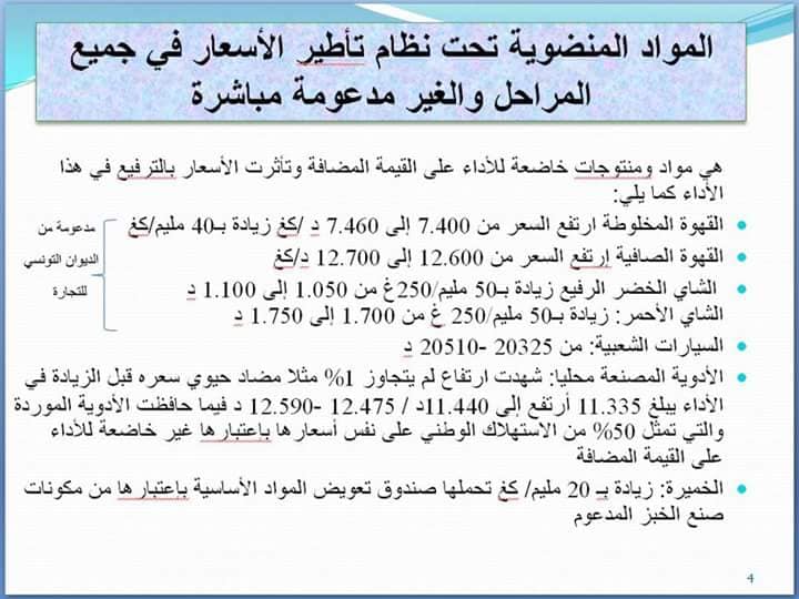 نشرت وزارة التجارة على صفحتها الرسمية على موقع التواصل الاجاماعي "الفايسبوك" قائمة بمختلف أسعار المواد والمنتجات المنضوية تحت حرية الأسعار والخاضعة للأداء على القيمة المضافة والتي تأثرت أسعارها بالترفيع في الأداء على الاستهلاك سواء بنسبة 10 أو 25 بالمائة.