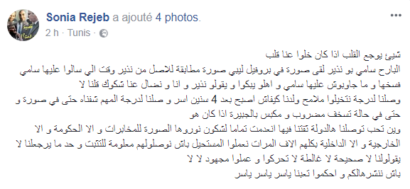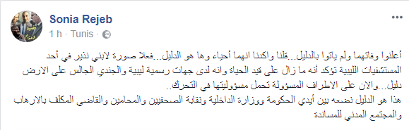 وأوضّحت سنية رجب، عبر تدوينة أرفقتها بالصورة، أنّ زوجها "سامي" عثر على الصورة في "بروفيل" شخص ليبي، إلا أنّه عندما سأل الشخص الليبي عن مصدر الصورة وإن كانت فعلا لابنه نذير أم لا، قام بحذفها مباشرة ولم يجبه.