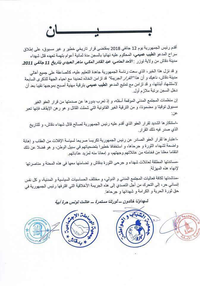وحسب نصّ البيان، فغنّ قرار العفو الصادر عن رئيس الجمهورية يعدّ تكريسا صريحا لسياسة الإفلات من العقاب، وإهانة واضحة لشهداء الثورة وجرحاها، واستخفافا خطيرا بتضحياتهم في سبيل الوطن، وانتقاما معلنا من عائلاتهم وجهتهم.