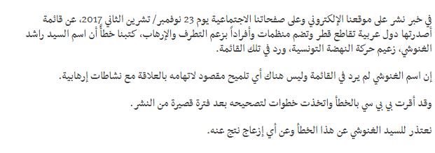 وأقرّت الشبكة بخطأها، حيث شدّدت على أنّ اسم الغنوشي لم يردّ في القائمة وليس هناك أي تلميح مقصود لاتهامه بالعلاقة مع نشاطات إرهابية.