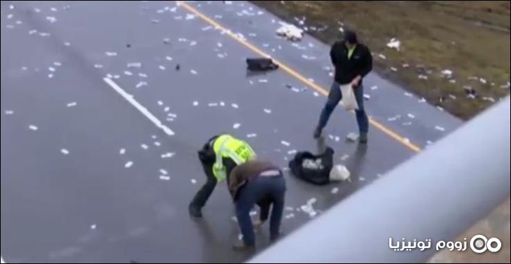 ويظهر شريط فيديو عناصر الشرطة وهم يجمعون الدولارات المتناثرة، التي كانت معظمها مبللة بفعل الأمطار.