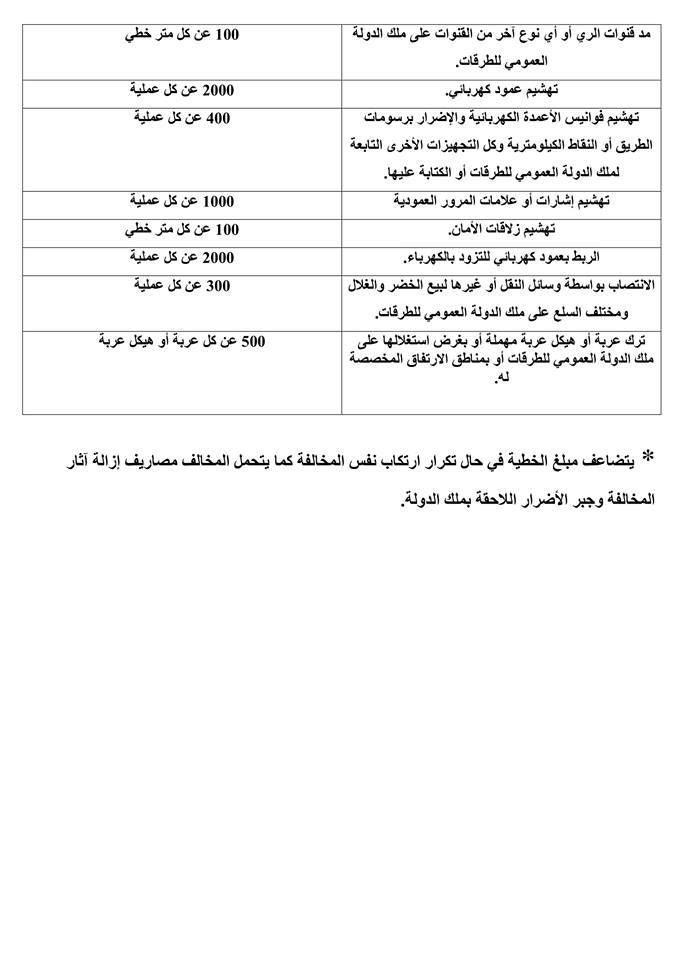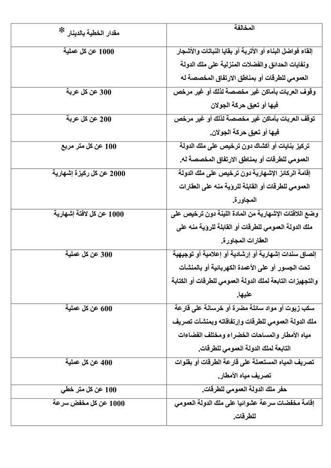 وتتراوح قيمة الخطايا بين 100 دينار أدناها وألفي دينار أقصاها مع الزيادة في مقدار الخطية بنسبة 10 بالمائة كل خمس سنوات.