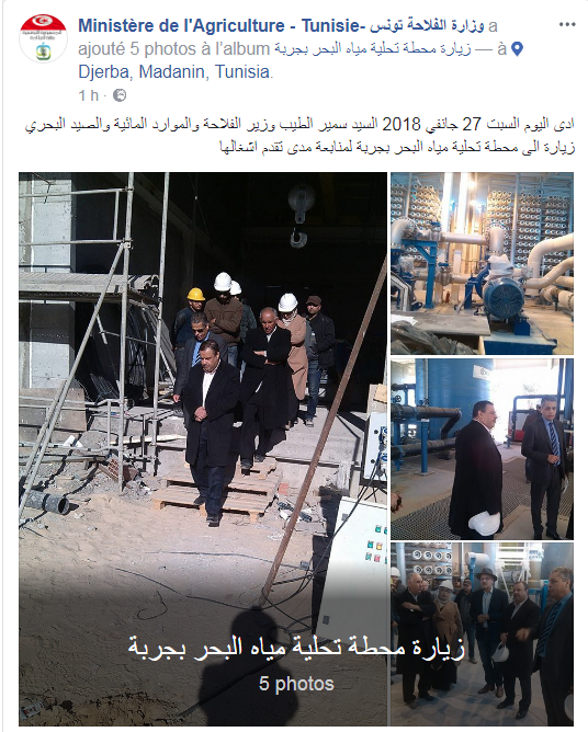 وفي هذا الإطار، أكّدت وزارة الفلاحة والموارد المائية والصيد البحري، على صفحتها لرسمية، أنّ سمير الطيب أدى اليوم زيارة إلى محطة تحلية مياه البحر بجربة لمتابعة مدى تقدم أشغالها.