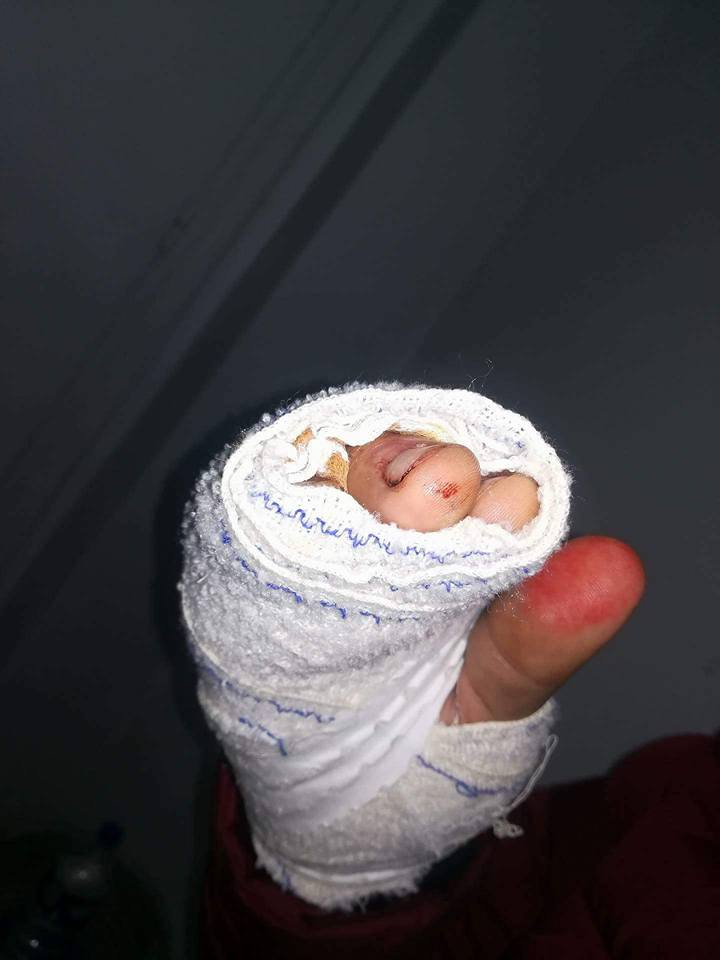 - آثار بقايا دم متجمّد على مستوى الرأس والأذن اليسرى.