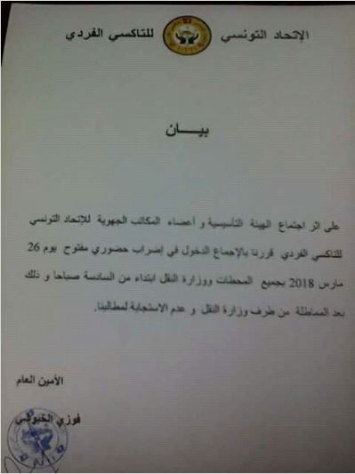 أعلنت الهيئة التأسيسية وأعضاء المكاتب الجهوية للاتحاد التونسي للتاكسي الفردي، في بيان اليوم الإثنين، الدخول في إضراب حضوري مفتوح يوم 26 مارس 2018.