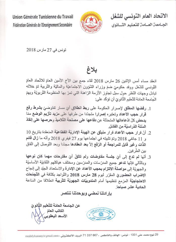 وجددت الجامعة العامة للتعليم الثانوي رفضها رفع قرار حجب الأعداد قبل انطلاق أي مسار تفاوضي.