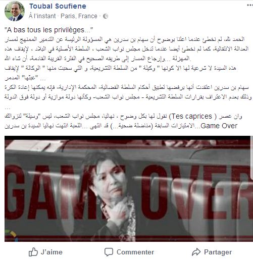 واضاف طوبال في تدوينة على صفحته الرسمية على الفايسبوك "نقول لها بكل وضوح ، نهائيا، مجلس نواب الشعب، ليس "وسيلة" لنزواتك (Tes caprices) وان عصر الامتيازات السابقة (مناضلة ضحية...) قد انتهى ...اللعبة انتهت نهائيا السيدة بن سدرين...Game Over".