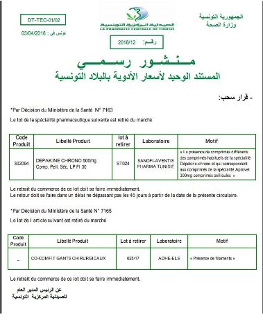 وشدّدت الصيدلية، من خلال منشور رسمي لها، وجّهته إلى كل صيدليات البلاد على ضرورة سحب الدواء من الأسواق التونسية في أجل أقصاه 45 يوما.