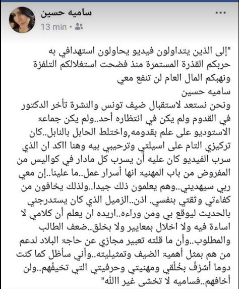 وفي هذا الإطار، قالت سامية حسين، في تدوينة على صفحتها بالفايسبوك، أنّه كان على من سرّب الفيديو أنّ يُسرّب كل مادار في الكواليس، مؤكّدة أنّهم يخافون كفائتها وثقتها بنفسها، وفق تعبيرها.