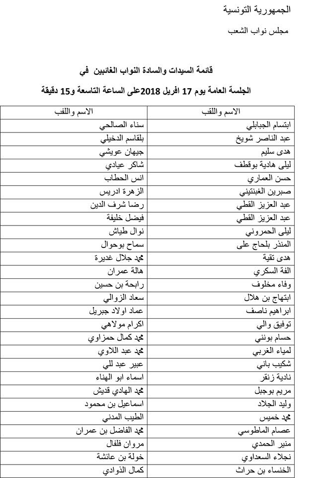 وكان رئيس مجلس نواب الشعب محمد الناصر قد أكّد أنّ المجلس سينشر قائمة النواب المتغيبين عن الجلسات العامة، وسيتمّ الاِقتطاع من منح النواب المتغيبين.
