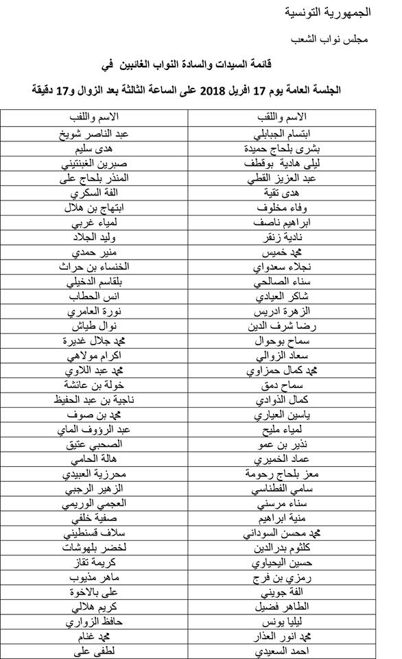 وسجلت هذه الجلسة غياب عدد هام من النواب، وفي ما يلي قائمة النواب الغائبين عن الجلسة على الساعة الثالثة بعد الزوال و17 دقيقة :