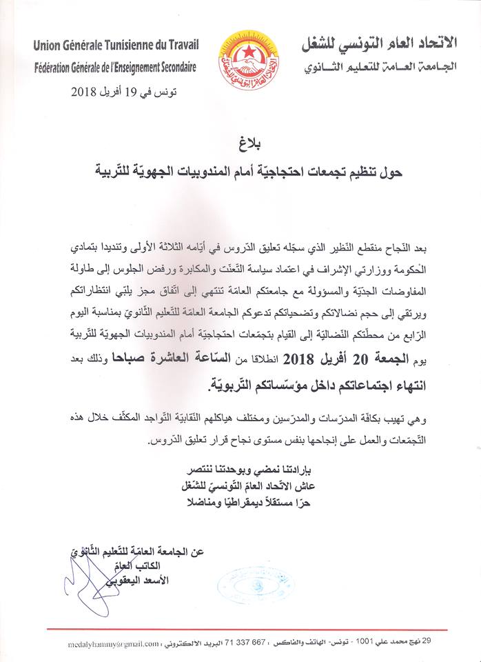 دعت الجامعة العامة للتعليم الثانوي، اليوم الخميس، الأساتذة إلى القيام بتجمعات احتجاجية أمام المندوبيات الجهوية للتربية غدا الجمعة 20 أفريل 2018، وذلك تزامنا مع اليوم الرابع من تعليق الدروس.