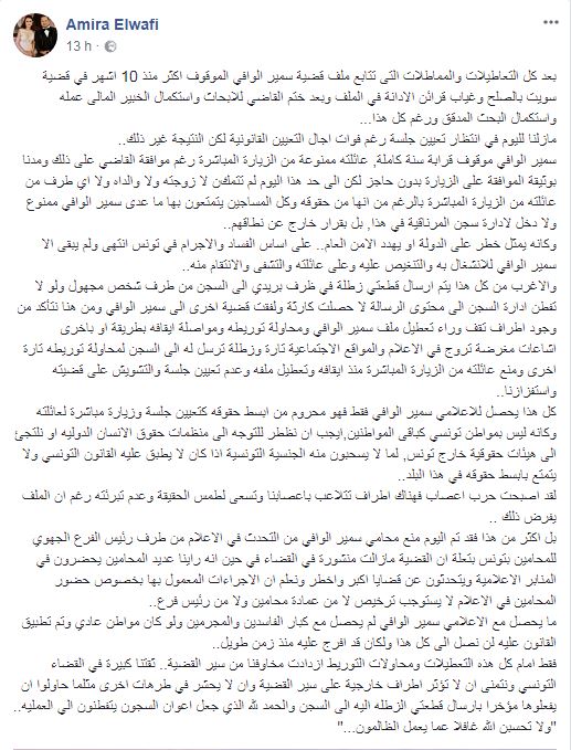 وكشفت أميرة الوافي، في تدوينة على صفحتها الخاصة بالفايسبوك، أنّ "عائلته ممنوعة من الزيارة المباشرة رغم موافقة القاضي على ذلك ومدهم بوثيقة الموافقة على الزيارة بدون حاجز لكن إلى حد هذا اليوم لم تتمكن لا زوجته ولا والداه ولا أي طرف من عائلته من الزيارة المباشرة بالرغم من أنّها من حقوقه وكل المساجين يتمتعون بها ما عدى سمير الوافي ممنوع ولا دخل لادارة سجن المرناقية في هذا، بل بقرار خارج عن نطاقهم".