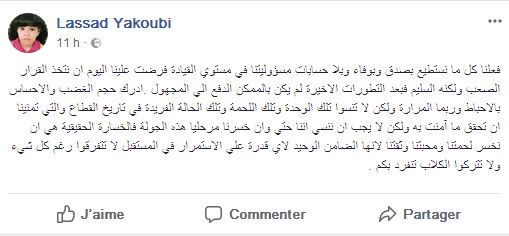وتابع اليعقوبي في تدوينة على صفحته الرسمية على الفايسبوك "يجب ان ننسي اننا حتى وان خسرنا مرحليا هذه الجولة فالخسارة الحقيقية هي ان نخسر لحمتنا ومحبتنا وثقتنا لانها الضامن الوحيد لاي قدرة علي الاستمرار في المستقبل".