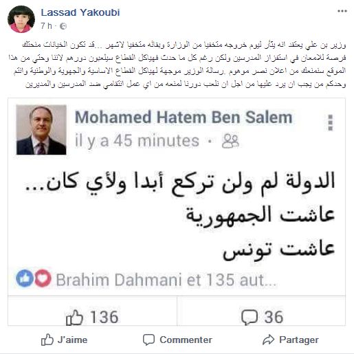 واضاف اليعقوبي في تدوينة أخرى على الفايسبوك "وزير بن علي يعتقد انه يثأر ليوم خروجه متخفيا من الوزارة وبقائه متخفيا لاشهر ...قد تكون الخيانات منحتك فرصة للامعان في استفزاز المدرسين ولكن رغم كل ما حدث فهياكل القطاع سيلعبون دورهم لاننا وحتي من هذا الموقع سنمنعك من اعلان نصر موهوم".