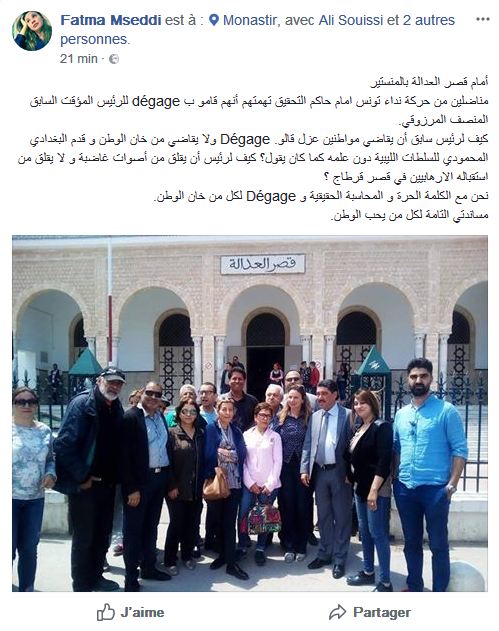 وقالت النائبة عن نداء تونس فاطمة المسدي في تدوينة نشرتها على صفحتها الرسمية على الفايسبوك "مناضلين من حركة نداء تونس امام حاكم التحقيق تهمتهم أنهم قامو ب dégage للرئيس المؤقت السابق المنصف المرزوقي" متابعة "كيف لرئيس سابق أن يقاضي مواطنين عزل قالو. Dégage ولا يقاضي من خان الوطن و قدم البغدادي المحمودي للسلطات الليبية دون علمه كما كان يقول؟ كيف لرئيس أن يقلق من أصوات غاضبة و لا يقلق من استقباله الارهابيين في قصر قرطاج ؟".