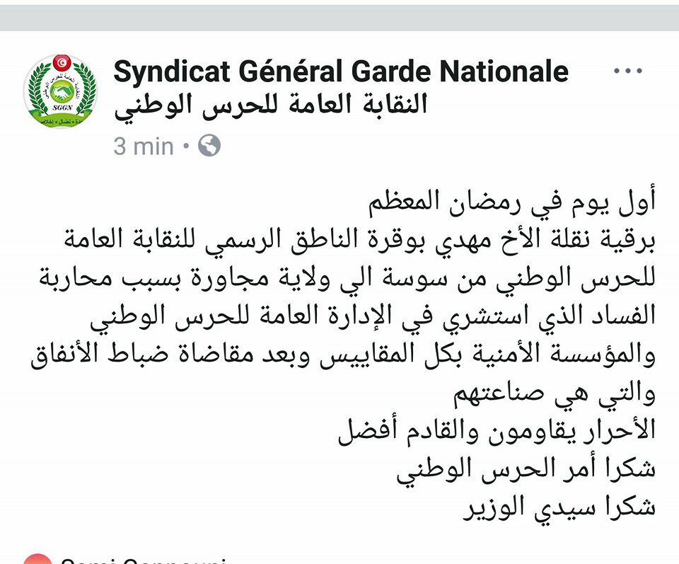 أكّدت النقابة العامة للحرس الوطني عبر صفحتها الرسمية بـ"الفايسبوك"، أنّه تمّ نقل الناطق الرسمي باسم النقابة مهدي بوقرة من ولاية سوسة إلى ولاية مجاورة "بسبب مواقفه".