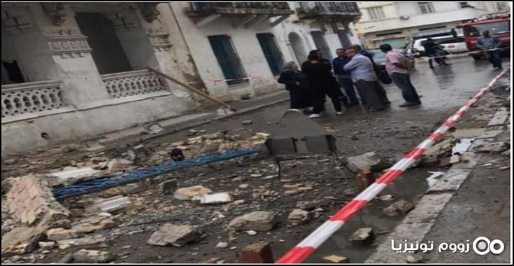 سقطت شرفتين من أحد العمارات المتداعية للسقوط بنهج الاطلس بمنطقة باب الخضراء بتونس العاصمة اليوم الاثنين 21 ماي 2018.