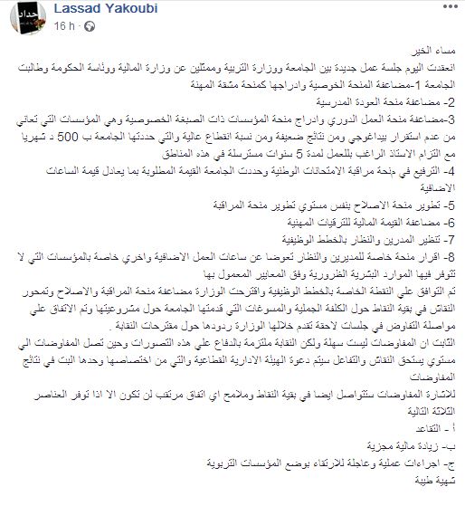 وأشار الكاتب العام لنقابة التعليم الثانوي لسعد اليعقوبي في تدوينة على صفحته الرسمية على الفايسبوك الى أنّ الجامعة قد طالبت خلال هذه جلسة بمضاعفة المنحة الخوصية وادراجها كمنحة مشقة المهنة إضافة الى مضاعفة منحة العودة المدرسية ومنحة العمل الدوري.