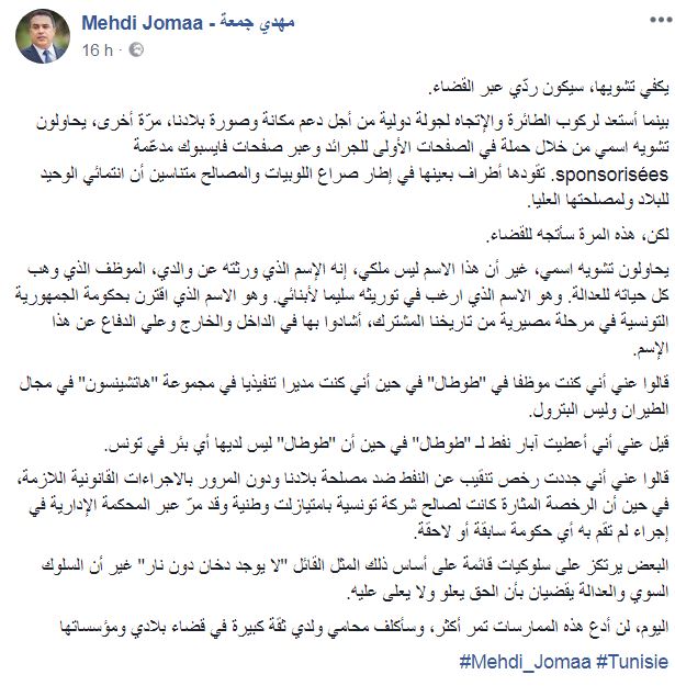وأكّد مهدي جمعة، عبر تدوينة على حسابه الرسمي بالفايسبوك، أنّه "لن يسكت هذه المرة عن حملة تشويه اسمه من خلال حملة في الصفحات الأولى للجرائد وعبر صفحات فايسبوك مدعّمة يقودها أطراف بعينها في إطار صراع اللوبيات والمصالح متناسين أن انتمائي الوحيد للبلاد ولمصلحتها العليا..لكن، هذه المرة سأتجه للقضاء''.