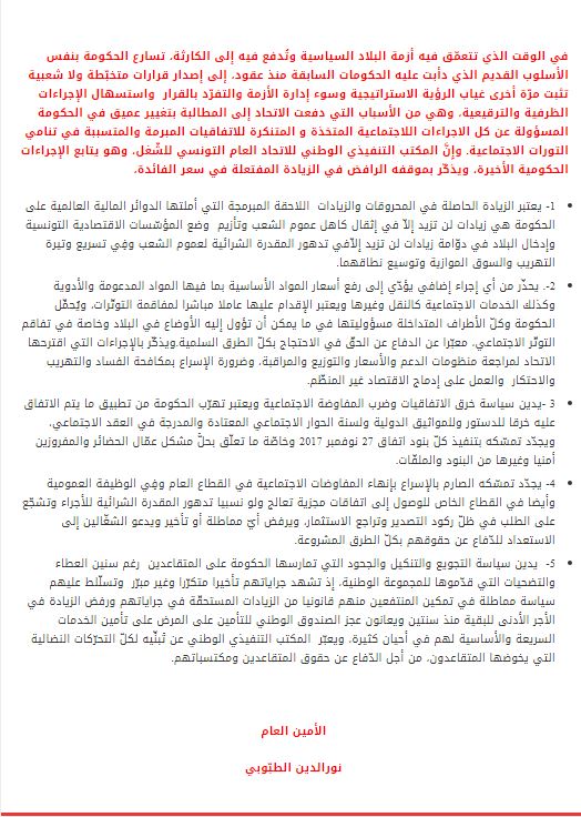 وندّد اتحاد الشغل من الزيادة في أسعار المحروقات وإلتهاب الأسعار وتعطل المفاوضات الإجتماعية، كما حذّر من "أيّ إجراء إضافي يؤدّي إلى الترفيع في أسعار المواد الأساسية بما في ذلك المواد المدعومة والأدوية والخدمات الاجتماعية كالنقل وغيرها".