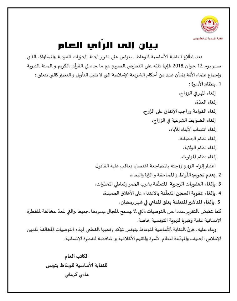 وأكّدت النقابة، في بيان لها، أنّ هذه التوصيات مخالفة للدّين الإسلامي الحنيف ومهدّمة لنظام الأسرة وللقيم الأخلاقية ومناقضة للفطرة الإنسانية"، مُنبّهة من "تعارض هذا التقرير تعارضا صريحا مع ما جاء في القرآن الكريم والسُّنّة النبوية".