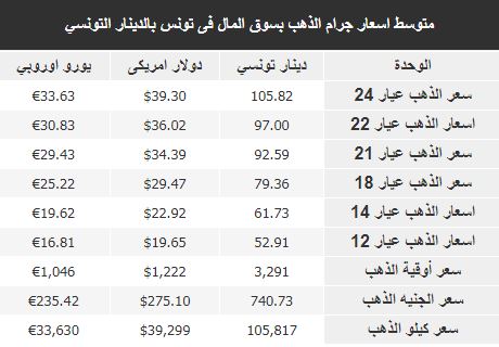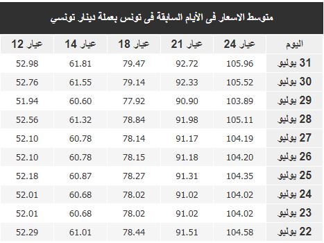 وسجلت الأسعار اليوم الأربعاء، 01 أوت 2018، انخفاضا طفيفا حيث وصل الغرام الواحد من الذهب عيار 24 قيراط إلى 105.91 دينار.