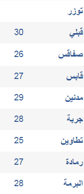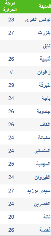وفي ما يلي الدرجات المسجلة اليوم الثلاثاء، 07 أوت 2018، على الساعة الواحدة بعد الظهر :