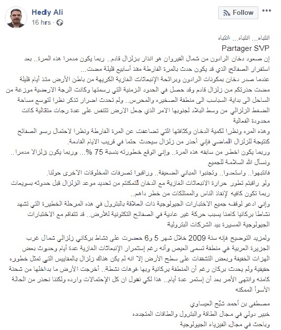 وقال العيساوي أنّ صعود هذا الدخان هو إنذار بزلزال قادم ربما يكون مدمرا يُنذر بزلزال قادم ويمكن أن يكون مدمرا ونسبة خطورته تتجاوز السبعين في المئة، حيث قال "أحذر من زلزال سيحدث حتما في قريب الأيام القادمة"، وفق تعبيره.