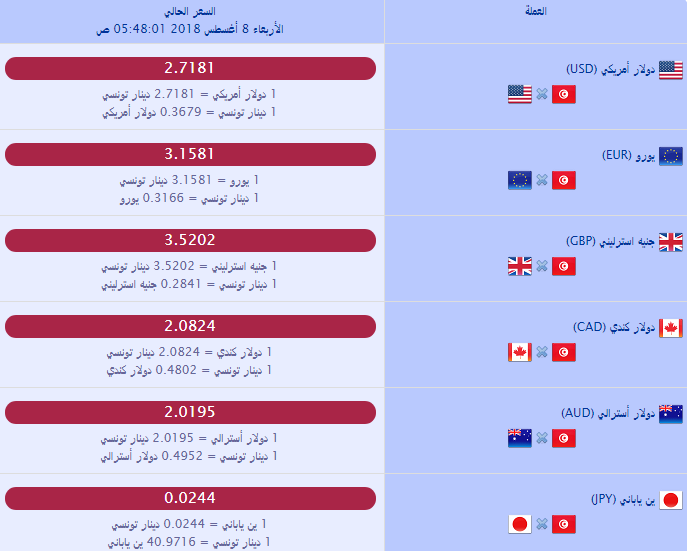 وفي ما يلي تفاصيل أسعار العملات العالمية بالدينار التونسي لهذا اليوم الأربعاء، 08 أوت 2018، خاصة أمام الأورو والدولار :