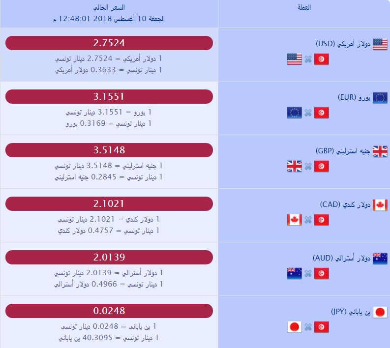 وفي ما يلي تفاصيل أسعار العملات العالمية بالدينار التونسي لهذا اليوم الأربعاء، 08 أوت 2018، خاصة أمام الأورو والدولار :