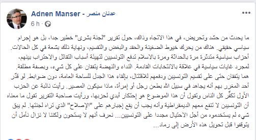 كما اِتهم عدنان منصر الأحزاب السياسية بدفع التونسيين للتقاتل والاحتراب بينهم، وفيما يلي نص التدوينة :
